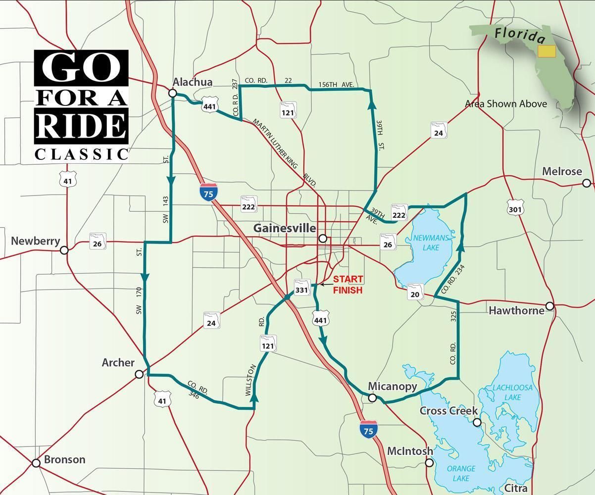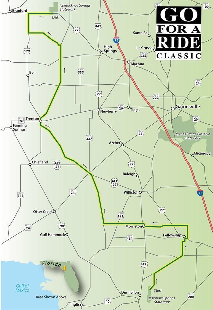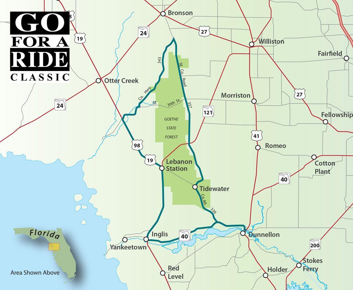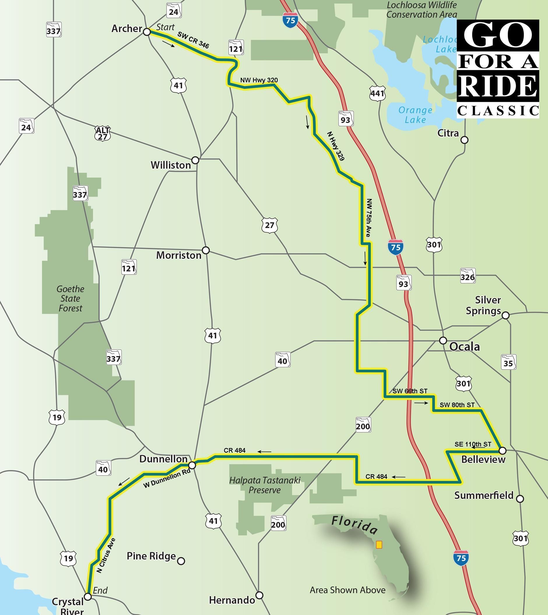 This ride begins in Archer, then meanders through Belleview before heading towards the Gulf and ending in Crystal River taking you through the heart of central Florida. Small towns, horse farms, and quaint country roads combine to make this a relaxing ride.
