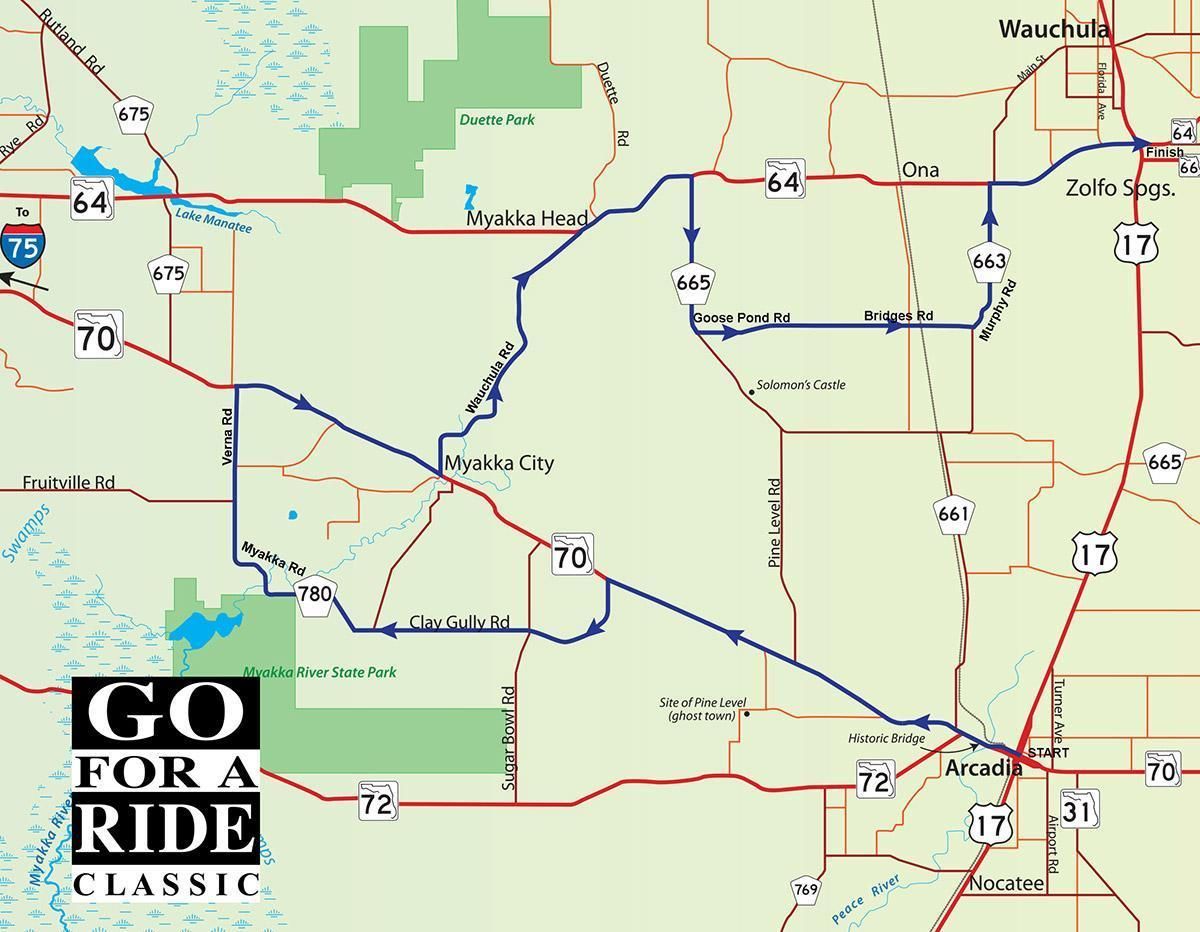 The route heads westward skirting along the boundary for the Myakka River State Park. The roads are flat, with mostly straight stretches interrupted by a few gentle curves. SR 64 is considered part of the Florida Cracker Trail which recognizes the important roles the cattle and horse industry played in this area's development.