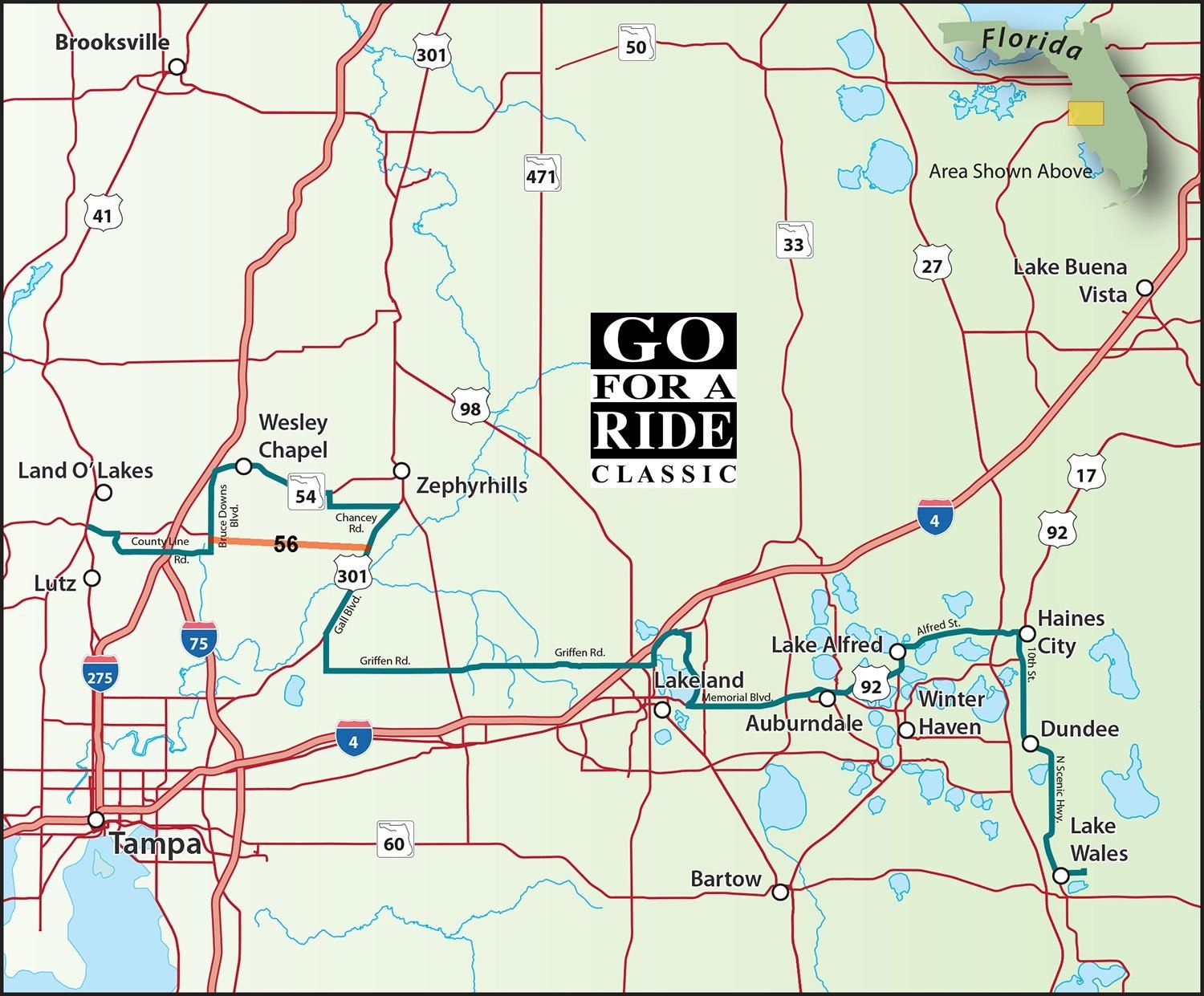 There are about two dozen Florida cities and towns with the word lake in their name. This ride hits a few of them. Start in Land O Lakes, then onto Lakeland and Lake Alfred, before ending in Lake Wales at the famous Bok Tower, which is not a water tower but contains a 60-bell carillon providing daily musical recitals. Ride Update: SR56 didn't exist when this map was first published. The ride has been updated to avoid the congestion on SR54. Yes, we agree, this entire area is a traffic mess.